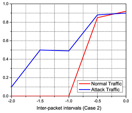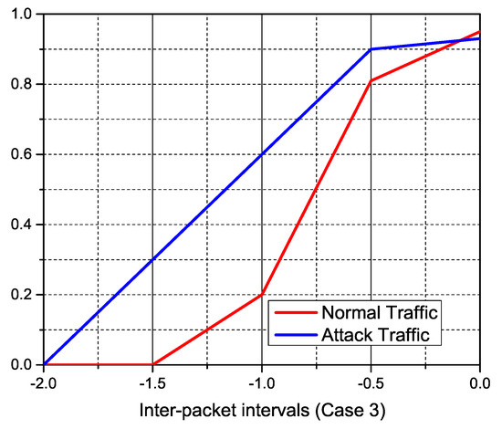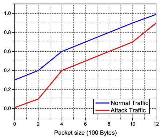 - Standard Deviation of Flow Packets (SDFP): This is the T periodw’s standard deviation for the number of packets:where n is the number of active network flows, is the number of packets of flow ith in T period, and is the number of packets of flow ith in T period, and is the average of all flows’ total packets across T periods. This feature has a strong link to the occurrence of a DDoS attack because, during an attack, the attacker transmits a large number of attack packets with a small size; these packets will have a significantly smaller standard deviation than typical data packets, resulting in a considerable drop in this parameter.