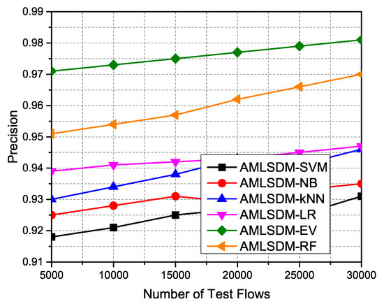 Figure 23 indicates that the adaptive AMLSDM-EV outperformed the static AMLSDM-SVM, AMLSDM-NB, AMLSDM-kNN, AMLSDM-LR, and AMLSDM-RF models. As the simulation duration increases, the overall performance of the adaptive machine learning-based AMLSDM-EV framework is improved in terms of the classification property of the DDoS framework. The major reason for this periodic improvement is due to the systemic improvement of the accuracy of the adaptive machine learning classification model. Among all other classifiers, the ascending order of achieved accuracy is as follows; AMLSDM-SVM, AMLSDM-NB, AMLSDM-kNN, AMLSDM-LR, and AMLSDM-RF. Meanwhile, the precision is computed by the following equation: