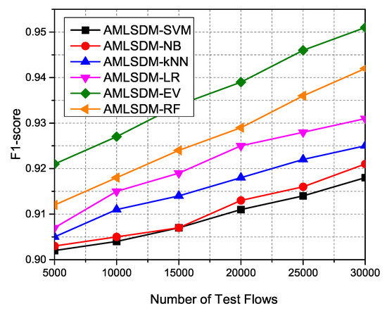 We perform extensive simulations of the AMLSDM framework with an EV trained model and also simulate the AMLSDM framework with a stand-alone trained model of SVM, NB, kNN, LR, and RF to compare the performance enhancement of adaptiveness of the proposed framework. We refer to these frameworks as AMLSDM-EV, AMLSDM-SVM, AMLSDM-NB, AMLSDM-kNN, AMLSDM-LR, and AMLSDM-RF. We capture the classification measurements of all frameworks for SDN-IoT network topology of Mininet for lengthy simulation periods to test 5000, 1000, 15,000, 20,000, 25,000, and 30,000 network flows entries in the “live.csv” dataset. DDoS detection dashboard of sFlow returns the periodic performance metrics of Accuracy, Precision, Recall, and F1 Score. These performance metrics are derived from the following factors; True Positive (TP), True Negative (TN), False Positive (FP), and False Negative (FN). The following equation computes the accuracy: