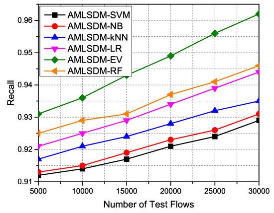 With higher accuracy, higher precision is also critical to understand the consistency of the designed framework. Figure 24 elaborates on the precision results of periodic simulation over different time duration. From this result, we can derive the fact that the overall precision of adaptive AMLSDM-EV also improves along with accuracy. However, the utilization of different classification algorithms provides minor performance fluctuations. As we witnessed the earlier better performance of the AMLSDM-EV in the case of higher accuracy, AMLSDM-EV similarly provides maximum precision as compared to AMLSDM-SVM, AMLSDM-NB, AMLSDM-kNN, AMLSDM-LR, and AMLSDM-RF trained models. To compute the correct positive cases from all the positive cases, the performance metric Recall is used, and the following equation can compute it as follows: