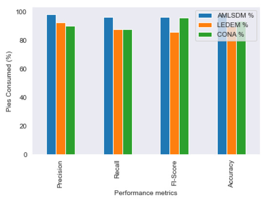Figure 27 shows the performance comparison of the proposed AMLSDM with state-of-the-art solutions, such as LEDEM [34] and CONA [19]. Our proposed AMLSDM framework provides better performance for all performance metrics of Accuracy, Precision, F1 Score, and Recall. The major edge of the proposed solution is an adaptive machine learning classification model to detect DDoS attacks.