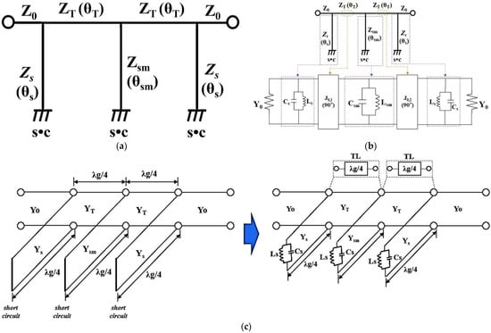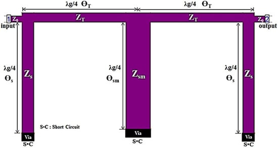 Figure 3b shows the equivalent circuit of the proposed BPF. The equivalent circuit of a proposed BPF consists of a resonant circuit (Cs//Ls and Csm//Lsm) and J–inverter (J0,1 and 0,2); the resonant circuit is connected to the inductors (Ls and Lsm) and capacitors (Cs and Csm) in the short–circuited shunt stubs with λg/4, as shown in Figure 3c. The J–inverter consists of a λg/4 transmission line [5,9]. Ls and Cs are the respective inductance and capacitance corresponding to the short stub Zs, while the Lsm and Csm are the inductance and capacitance corresponding to the stub (Zsm). In Figure 3c, the J–inverter is configured with the λg/4 transmission line (TL), which has a phase response of 90 degrees. In addition, the shunted short stubs are configured with the inductance (Ls and Lsm) and capacitance (Cs and Csm) resonant circuits. Then, the short stubs with the inductance and capacitance resonant circuits have a phase response of 90 degrees. Here, the Yo is the characteristic admittance, and the Ys and Ysm are characteristic of admittance for short stubs. YT is characteristic of the admittance of the transmission line. Figure 4 shows the SIR structure; the Zs and Zsm are both high impedance SIR, while ZT is a low impedance SIR, the input impedance (Zi) values are given by Equations (1) and (2) [18,19], where Yi is the input admittance.
