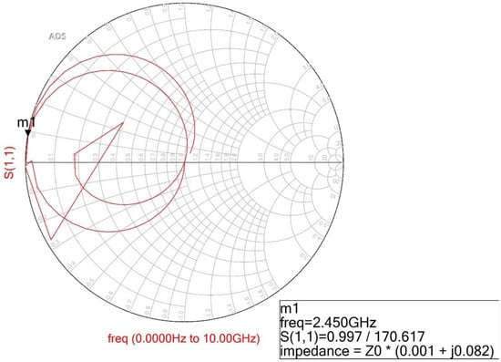 Figure 2 shows the simulation result of the Smith chart. In the figure, the real and imaginary impedance are 0.001 + j0.082 with a bandwidth of 120% at a center frequency of 2.45 GHz in the conventional BPF. However, the proposed BPF does not have the structure and conditions of a conventional BPF.