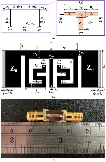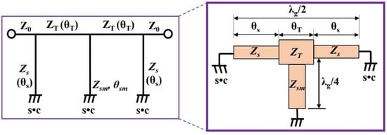 The proposed BPF is composed of a T–shaped SIR transmission line and a folded short stub, as shown in Figure 3a. In the figure, Zs and Zsm are the characteristic impedance of the folded short stubs, while ZT is the characteristic impedance of the T–shaped transmission line. As shown in the figure, θs and θsm are the electrical length of the folded short stubs, while θT is the electrical length of the T–shaped transmission line.