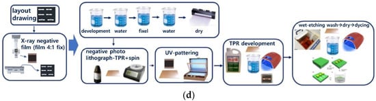 Figure 7c shows the proposed BPF fabricated on a Teflon substrate that has a low dielectric constant of 2.54 and a height of 0.54 mm. In the fabrication process, the film is developed through development, water, fixer, and drying processes through X–ray imaging, as shown in Figure 7d, to manufacture the filter. The substrate is put on the spin quarter, the photo resistor (TPR) solution is applied, and the spin operation is performed. Then, after UV–patterning of the substrate and film, the TPR solution is sacrificed using TPR development. Finally, the production of the filter is completed through wet etching [20].