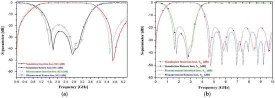 The results from the simulations and experiments on the proposed BPF with a T–shaped SIR transmission line and folded SIR short stubs are shown in Figure 8. As seen in the figure, the filter through simulation gave insertion and return losses of 0.10 dB and 24.9 dB, respectively, and a bandwidth of 120% at a center frequency of 2.45 GHz (0.94 to 3.88 GHz band), the experiment gave insertion and return losses of 0.10 dB and 19.2 dB, respectively, with a bandwidth of 120% at a center frequency of 2.44 GHz (0.85 to 3.85 GHz band).