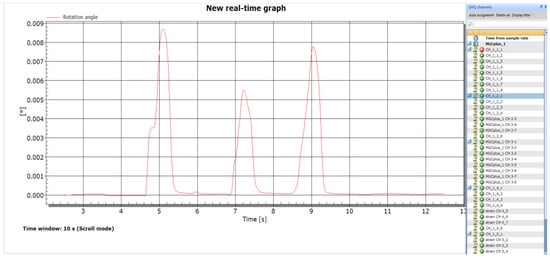 The data acquisition module interface contains the real-time output curve of measured rotation versus time (right part in Figure 5) and inclinometer list (left column in Figure 5), which is designed for multiple inclinometers measurement for in-situ application. The maximum data acquisition frequency is determined by the HBM system, which is 9.6 kHz.