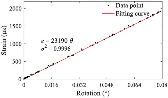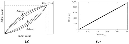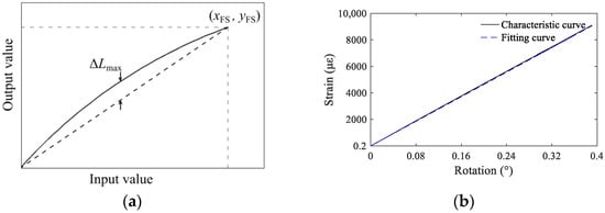 Linearity refers to the coincidence degree between the actual characteristic curve of the transducer and the reference line, as shown in Figure 10a. The nonlinear error, e1, of the characteristic curve can be calculated using Equation (12) [44]. A smaller nonlinear error indicates less the influence of the initial state on the characteristic relationship between the input value and the output value of the transducer. Thus, any point within the measurement range can be used as the initiation point for relative monitoring. The calibration test data in Section 3.3 were used as a basis to determine the actual linearity of the present device. Different rotation angle values were input into the monitoring equipment within its measurement range to obtain the actual characteristic curve of rotation–strain conversion, as shown in Figure 10b. Using the line between the starting point and the maximum point of the measured data as the reference line, the nonlinear error of the present monitoring equipment was calculated to be 0.76%.