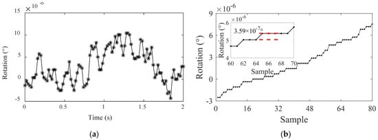 Resolution of an instrument refers to the ability to capture the smallest change in the measurand. For the proposed inclinometer, it first relies on strain measurement resolution. Then amplification of the rotation angle by the inclinometer also increases the resolution. The actual resolution can be obtained based on the calibration data in Section 3.3. One of the rotation time-history curves was selected, as shown in Figure 9a, and the measured data was sorted based on the magnitude, as shown in Figure 9b.