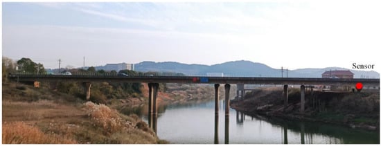 To further verify the feasibility and function of the proposed inclinometer, an expressway bridge called Jinjiang Bridge in Changsha City, Hunan Province (as shown in Figure 12), was selected to conduct in-situ experiments. Real-time beam-end rotation data generated by the random vehicle loads were captured and analyzed. The monitored bridge is a five-span (each span measures 60 m) continuous bridge aligned in the east–west direction. The superstructure is a prestressed concrete single-cell box girder. No lane closures were required during the experiment. Therefore, the beam-end rotation monitoring was carried out during the actual operation of the bridge.