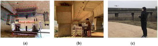 In the field experiment, the inclinometer was set at the beam end at the supporting pier of the first span, as shown in Figure 12. Taking the pier as the fixed reference point, the rotation angle of the beam end relative to the pier was measured in real-time. The gap between the pier and the bridge was 29 cm, which was slightly higher than the height of the inclinometer main part. Thus, the connection bolts were used to adjust height for correct installation. High-strength structural epoxy with maximum tensile strength of 6.5 MPa was used to fix the inclinometer on the beam and pier, as shown in Figure 13a. A temporary working platform was set up near the monitoring point to for data acquisition and the sampling frequency was 50 Hz. The in-situ monitoring setup is shown in Figure 13b. An unmanned aerial vehicle (UAV) was used to photograph the bridge deck to synchronously record the vehicle loads, as shown in Figure 13c.