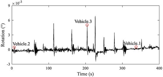 During the experiment, the dynamic changes in the beam-end rotation were recorded. The UAV captured video was utilized to mark each passing vehicle with time synchronization to the rotation data. A typical 10 min period of data was selected for analysis, as shown in Figure 14. It was evident that when a vehicle passed the monitored span, rotation response of the beam end was effectively captured by the proposed inclinometer. The captured data were compared with the UAV photos and it showed that different amplitude signals correlated to different vehicles sizes (small, medium, and large).