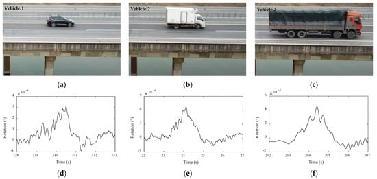 The time-history data in Figure 14 were divided into segments to isolate each rotation response when only a single vehicle crossed the span. Three typical data for different sizes of vehicles, together with the corresponding photos captured by the UAV, are shown in Figure 15. Figure 15a–c show the different sizes vehicles in each section, and Figure 15d–f show the corresponding beam-end rotation response curves. It is evident that the time required by each vehicle to pass the monitored span was approximately 2 s, indicating that the three vehicles traveled across the bridge at a high speed of approximately 110 km/h (speed limit of the bridge is 120 km/h). The changes in the amplitude of the rotation angle caused by vehicle 1, vehicle 2, and vehicle 3 were 6.2 × 10−4, 3.2 × 10−4, and 46.8 × 10−4 (°), respectively. The beam-end rotation and corresponding vehicle sizes and weight are listed in Table 3.