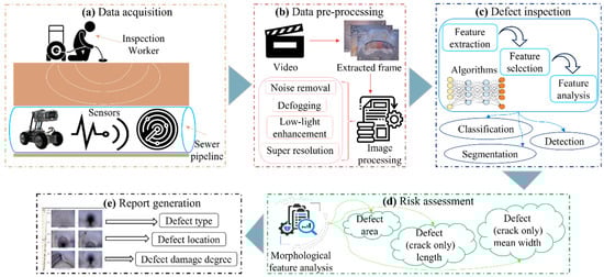 There are five stages in the defect inspection framework, which include (a) the data acquisition stage based on various sensors (CCTV, sonar, or scanner), (b) the data processing stage for the collected data, (c) the defect inspection stage containing different algorithms (defect classification, detection, and segmentation), (d) the risk assessment for detected defects using image post-processing, and (e) the final report generation stage for the condition evaluation.