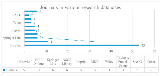 A thorough search of the academic studies was conducted by using the Scopus journal database. It automatically arranges the results from different publishers, which include Elsevier, Springer Link, Wiley online library, IEEE Xplore, ASCE Library, MDPI, SACG, preprint, Taylor & Francis Group, and others. Figure 2 shows the distribution of the academic journals reviewed in diverse databases. The journals in the other databases include SPIE Digital Library, Korean Science, Easy Chair, and Nature. In order to highlight the advances in vision-based defect inspection and condition assessment, the papers of these fields that were published between 2000 and 2022 are investigated. The search criterion of this survey is to use an advanced retrieval approach by selecting high-level keywords like (“vision-based sensor” OR “video” OR “image”) AND (“automatic sewer inspection” OR “defect classification” OR “defect detection” OR “defect segmentation” OR “condition assessment”). Since there is no limitation on a certain specific construction material or pipe typology, the research on any sewer pipeline that can be entered and that obtained visual data is covered in this survey. Nevertheless, the papers that focus on some topics, which do not relate to the vision-based sewer inspection, are not included in this paper. For example, the quality assessment for sewer images [25], pipe reconstruction, internal pipe structure, wall thickness measurement, and sewer inspections based on other sensors such as depth sensors [26,27], laser scanners [28,29], or acoustic sensors [30,31] are considered irrelevant topics. Figure 3 represents the number of articles including journals and conference papers in different time periods from 2000 to 2022. By manually scanning the title and abstract sections, a total of 124 papers that includes both journals (95) and conferences (29) in English was selected to examine the topic’s relevancy. In addition to these papers, four books and three websites were also used to construct this survey. After that, the filtered papers were classified in terms of the employed methods and application areas. Finally, the papers in each category were further studied by analyzing their weaknesses and strengths.
