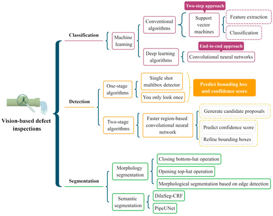 In this section, several classic algorithms are illustrated, and the research tendency is analyzed. Figure 4 provides a brief description of the algorithms in each category. According to the literature review, the existing studies about sewer inspection are summarized in three tables. Table 2, Table 3 and Table 4 show the recent studies about defect classification (Section 3.1), detection (Section 3.2), and segmentation (Section 3.3) algorithms. In order to comprehensively analyze these studies, the publication time, title, utilized methodology, advantages, and disadvantages for each study are covered. Moreover, the specific proportion of each inspection algorithm is computed in Figure 5. It is clear that the defect classification accounts for the most significant percentages in all the investigated studies.