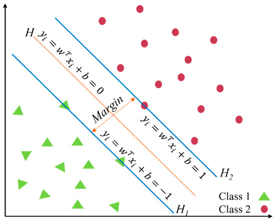SVMs have become one of the most typical and robust ML algorithms because they are not sensitive to the overfitting problem compared with other ML algorithms [35,36,37]. The principal objective of an SVM is to perfectly divide the training data into two or more classes by optimizing the classification hyperplane [38,39]. A classification hyperplane equation can be normalized in order to form a two-dimensional sample set that satisfies Equation (1).