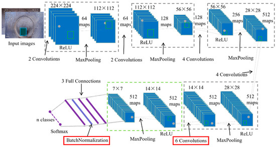A CNN was first proposed in 1962 [46], and it has demonstrated excellent performances in multiple domains. Due to its powerful generalization ability, CNN-based classifiers that automatically extract features from input images are superior to the classifiers that are based on the pre-engineered features [47]. Consequently, numerous researchers have applied CNNs to handle the defect classification problem in recent years. Kumar et al. presented an end-to-end classification method using several binary CNNs in order to identify the presence of three types of commonly encountered defects in sewer images [48]. In their proposed framework, the extracted frames were inputted into networks that contained two convolutional layers, two pooling layers, two fully connected layers, and one output layer. The classification results achieved high values in terms of average accuracy (0.862), precision (0.877), and recall (0.906), but this work was limited to the classification of ubiquitous defects.