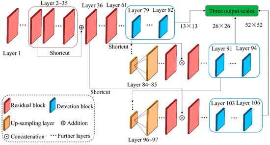 YOLO is a one-stage algorithm that maps directly from image pixels to BBs and class probabilities. In [84], object detection was addressed as a single regression problem using a simple and unified pipeline. Due to its advantages of robustness and efficiency, an updated version of YOLO, which is called YOLOv3 [91], was explored to locate and classify defects in [9]. YOLOv3 outperformed the previous YOLO algorithms in regard to detecting the objects with small sizes because the YOLOv3 model applies a 3-scale mechanism that concatenates the feature maps of three scales [92,93]. Figure 8 illustrates how the YOLOv3 architecture implements the 3-scale prediction operation. The prediction result with a scale of 13 × 13 is obtained in the 82nd layer by down-sampling and convolution operations. Then, the result in the 79th layer is concatenated with the result of the 61st layer after up-sampling, and the prediction result with 26 × 26 is generated after several convolution operations. The result of 52 × 52 is generated at layer 106 using the same method. The predictions at different scales have different receptive fields that determine the appropriate sizes of the detection objects in the image. As a result, YOLOv3 with a 3-scale mechanism is capable of detecting more fine-grained features.