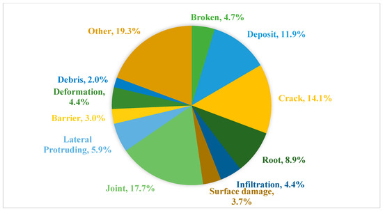 Underground sewerage systems (USSs) are a vital part of public infrastructure that contributes to collecting wastewater or stormwater from various sources and conveying it to storage tanks or sewer treatment facilities. A healthy USS with proper functionality can effectively prevent urban waterlogging and play a positive role in the sustainable development of water resources. However, sewer defects caused by different influence factors such as age and material directly affect the degradation of pipeline conditions. It was reported in previous studies that the conditions of USSs in some places are unsatisfactory and deteriorate over time. For example, a considerable proportion (20.8%) of Canadian sewers is graded as poor and very poor. The rehabilitation of these USSs is needed in the following decade in order to ensure normal operations and services on a continuing basis [1]. Currently, the maintenance and management of USSs have become challenging problems for municipalities worldwide due to the huge economic costs [2]. In 2019, a report in the United States of America (USA) estimated that utilities spent more than USD 3 billion on wastewater pipe replacements and repairs, which addressed 4692 miles of pipeline [3].