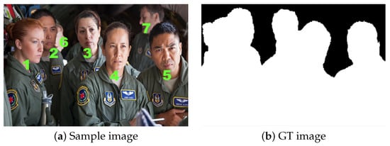 The figure represents the two images, i.e., the original sample image along with its respective GT image. The sample image numerically identifies the blurred and non-blurred objects: the non-blurred objects are represented by 1, 2, 3, 4, and 5, respectively, whereas the rest are blurred objects. In the GT image, white indicates the non-blurred objects, whereas the black spots identify the blurred region.