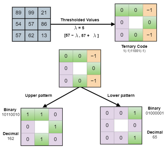 Tan and Triggers [62] proposed an efficient texture operator approach that resolves the noise sensitivity issue involved in LBP. LTP is the extended version of LBP, which has a 3-valued code such as −1, 0, 1. One of the examples of the LTP descriptor is depicted in Figure 3. The LTP metric is described mathematically by [63] in Equation (3) and Equation (4) as given below: