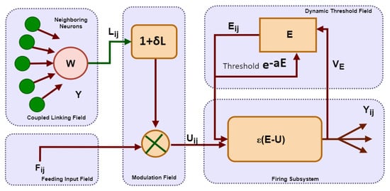 The PCNN model is depicted in Figure 4. The mathematical representation of the five subsystems in the model is given as follows in Equations (7)–(11):
