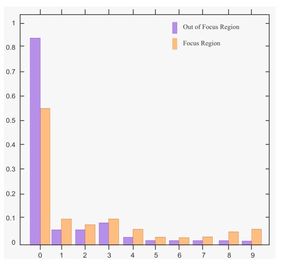 In defocus image segmentation, a sample input image () is applied that contains in-focused and unfocused regions. If () is a color image, then in the first step, the gray-scale image () will be produced from a color image. Maintaining the image’s local structure, for this purpose, the median filter function is used in the next step for overcoming the factor noise, and monotonic illumination transformation of in-focused and blurred smooth region. The median filter function is given below in Equation (35):