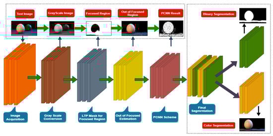 In this section, the proposed steps along with the proposed segmenting algorithm are elaborated and shown in Figure 6. First, the pre-processing step filters the image and then transforms it into a gray scale. The LTP mask to produce sharpness is described in the next step, whereas the out-of-focused region estimation is explained in the third step. The fourth step is expanded about the PCNN model structure, while the proposed algorithmic definition following Algorithm 1 is illustrated at the start of the section.