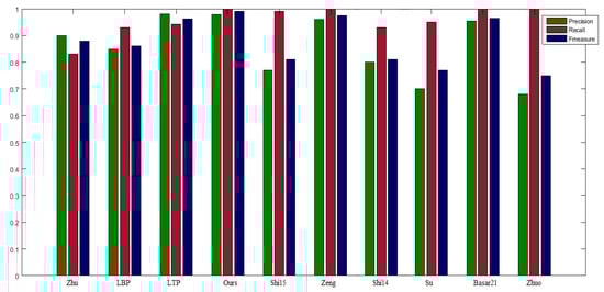 We adopted the fuzzy approach in this study to classify proposed and referenced algorithms in their proper ranking category. The image segmentation-based fuzzy methods are majorly involved in numerous areas, for example, fuzzy set theory, genetic algorithm, supplier segmentation [24], pattern recognition, neural networks, computer vision, and image processing [25]. Ghorabaee et al. [26] proposed a technique based on Fuzzy Logic (FL), called Evaluation Based on Distance from Average Solution (EDAS). It is a scheme of Multiple Criteria-Decision-making Method (MCDM), used for the classification of inventory [27]. The FL-based EDAS approach is usually applied to rank numerous algorithms to appropriately classify the top algorithms concerning the accuracy, time, and speed. It is observed from Table 10 that the proposed scheme is ranked on top, while Zeng [23], and LTP [22] are positioned on the second and third rank, Basar21 [21], and Zhu [19] on the fourth and fifth rank. LBP [20], Shi14 [16], Su [17], Shi15 [14], and Zhuo [18] are ranked on sixth, seventh, eighth, ninth, and tenth, respectively.