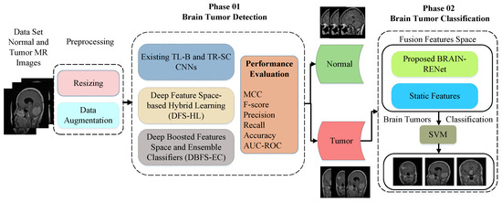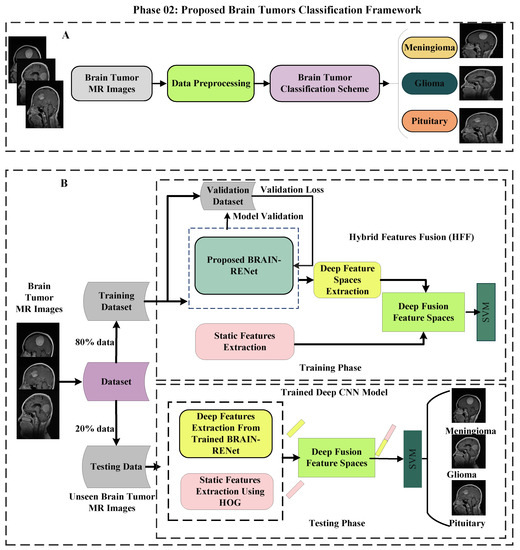 The detailed architecture of the proposed DHL-DC framework is explained in this part. The proposed framework includes two phases. A deep-boosted features space and ensemble classifiers (DBFS-EC) method for brain tumor detection is proposed in the phase 01. In the phase 02, a hybrid features fusion-based brain tumor classification (HFF-BTC) model is proposed to classify brain tumor MR images detected from the first phase into three different classes: meningioma, glioma, and pituitary. MR images are categorized into different types by employing the proposed novel BRAIN-RENet based model. Feature space diversity is attained by composing a fusion feature space comprised of dynamic and static features. The proposed multi-stage brain tumor detection and classification framework is shown in Figure 1.