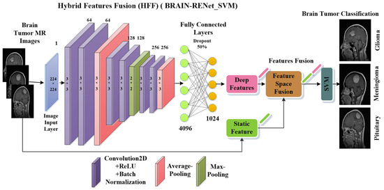 Tumor classification is essential for designing effective treatment and diagnosis processes. Thus, brain MR images recognized as the tumor in the detection stage by using the proposed DBFS-EC are allocated to the brain tumor classification model for tumor categorization. In the classification phase, we have proposed a hybrid features fusion-based approach for tumor MR images categorization into particular classes, namely, meningioma, glioma, and pituitary. Dynamic and static features are concatenated to enhance the feature space diversity, and classification ability enhancement of the model is achieved by employing an ML classifier (SVM). Deep features are extracted by using the proposed novel BRAIN-RENet, and static features are extracted by using the HOG descriptor.
