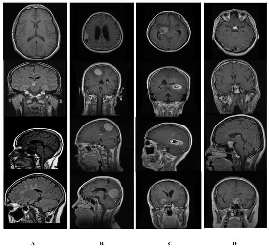 Sample image from dataset of normal and tumor images. (A) Normal. (B) Glioma. (C) Meningioma. (D) Pituitary.