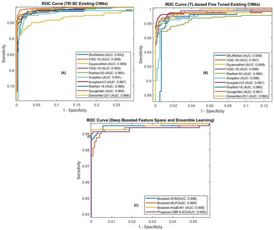 ROC curve for the existing CNNs, TR-SC based in (A), TL-B models in (B), and (C) represent proposed (DBFS-EC) framework.