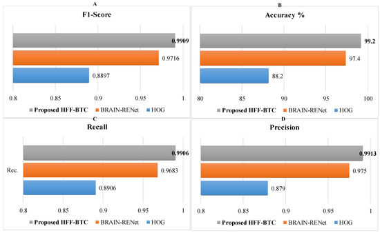 The proposed model’s performance is assessed with the proposed BRAIN-RENet and several ML-based models. Table 7 shows the performance comparison of the proposed hybrid learning-based model containing fusion feature spaces with SVM, other HFF models, and the proposed BRAIN-RENet. Performance of the proposed HFF-BTC model is evaluated for standard metrics and attain recall (0.9913), precision (0.9906), accuracy (99.20%), and F1-Score (0.9909). This framework outperformed the existing techniques in recognizing the tumor in MRI images.