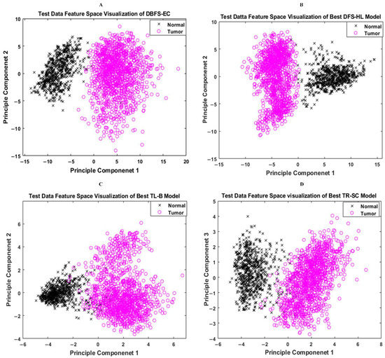 Feature space visualization of the proposed DBFS-EC framework (A), DFS-HL (B), well-performing TL-B (C), and TR-SC (D) models.