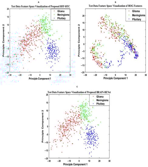 Feature space visualization of the proposed HFF-BTC framework (A), HOG descriptor (B), and proposed BRAIN-RENet (C).