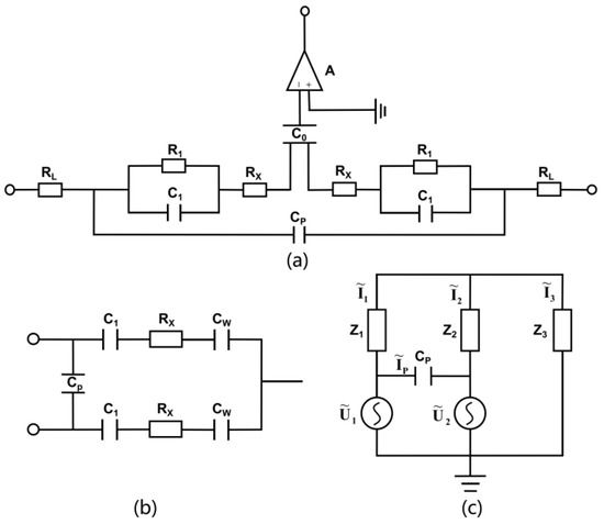 The structural design of the sensor is shown in the Figure 3. In Figure 3a, RL is the equivalent resistance of electrode lead, C1 is the double layer polarization capacitance caused by electrode polarization, R1 is the equivalent polarization resistance formed by electrode polarization effect, Rx is the solution resistance, CP is the equivalent capacitance of electrode lead distribution, C0 is the capacitance of wall, and A is the operational amplifier.