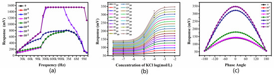 Experimental results of parameter optimization. (a) Frequency; (b) Concentration of KCI log; (c) Phase angle.