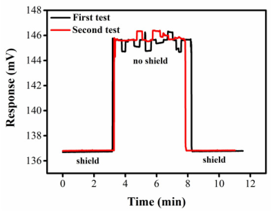 The sensor detection pool is placed in the shielding box, and the anti-interference performance of the device is verified by applying an external signal interference on the solution pipe outside the shielding box. As shown in Figure 5, when the sample in the cell is ultrapure water, signal interference occurs in the shielding box before 3 min and after 8 min, and the response signal is basically unchanged with good reproducibility after repeating the test twice. On the contrary, the response value varies irregularly with the external signal interference in the case of no shield for about 3–8 min. It indicates that the device has strong ability to resist external interference. In order to show the effect of the shielding box on noise interference to the greatest extent, we chose module AD637 to replace the lock-in amplifier for detection because the phase lock reduced the interference signal to a certain extent.