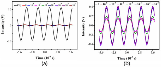 Figure 6 shows the monitoring diagram of the detection process of each sensing part of the sensor visually. It can be seen from Figure 6a,b that the output signal of the larger excited sinusoidal wave is significantly weakened after the voltage signal passes through the coupled capacitive reactance in the circuit. It can also be explained that the excitation signal can propagate relatively intact through the contact electrode because the capacitance generated by the electrode polarization of the contact electrode is large enough and the capacitance reactance is small. Both the solution impedance and the coupling capacitance of the non-contact electrode produce high reactance, which results in a greatly reduced voltage signal from the detection cell.