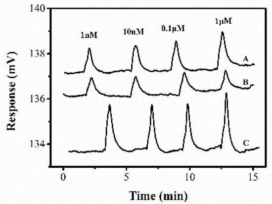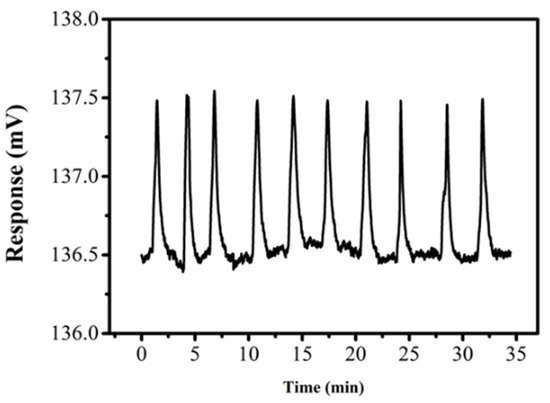 Considering the interference of accidental factors, we verified the repeatability of the detector test results. From Figure 10, intuitively, we can see that after 10 consecutive tests, the response value of 10 nM potassium chloride solution fluctuates around the voltage line of 137.5 mV at each gradient point. The sensor is accompanied by common electronic noise. The effect of noise on DISODCD is weak, but there is a low baseline drift, which makes the whole baseline fluctuate around the voltage line of 136.5 mV. The difference in shape, width, and peak point across the response is small, which shows that the detector has good reproducibility and can be used as a general purpose sensor. In the measurement process, we have to ensure that the repeated tests are carried out in the same environment and the experiments are under optimal conditions. In addition, it is worth noting that when verifying low concentration solution, the fresh solution is selected to avoid air entering the liquid to interfere with real results.