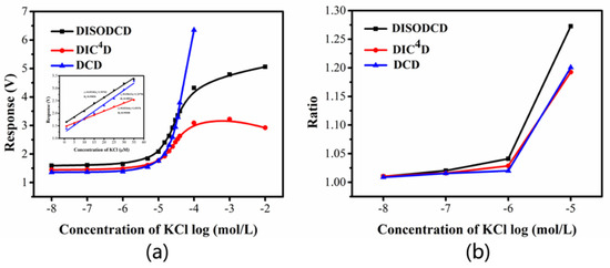 Response of DISODCD, DIC4D, and DCD to 0.01 μM-10 mM KCl solution. (a) Response curve of DISODCD, DIC4D, and DCD. (b) The ratio of the response of DISODCD, DIC4D, and DCD.