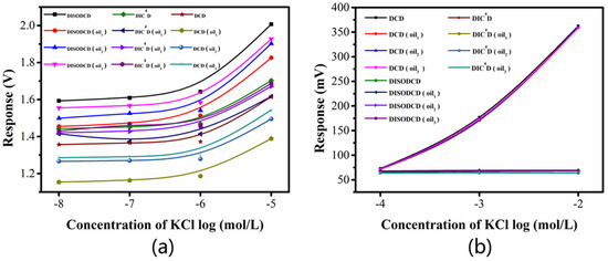 Signal response diagram of DCD, DIC4D, and DISODCD sensors to KCl solution disturbed by oil impurities. (a) Response graphs of 0.01–10 μM KCl solution were tested 3 times; (b) Response graphs of 0.1–10 mM KCl solution were tested 3 times.