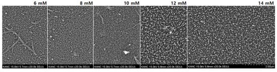 PANI films are deposited on the PDMS surface by the dilute polymerization process. First, the concentration at which PANI can be most evenly formed on the surface was selected. The typical ratio of aniline to APS is 1.5 [18]. However, we tried to find the most suitable synthesis concentration of aniline in the range of 6–14 mM while fixing the APS concentration as shown in Figure 1. The density with 14 mM of aniline is sufficiently ensured and better as compared to other concentrations. Therefore, we prepare 14 mM of aniline solution and 9.33 mM APS solution in 1 M perchloric solution, followed by precooling for 30 min. The surface-treated PDMS substrate is attached to the beaker, and the prepared aniline solution is first added, followed by slow addition of the prepared APS solution. The beaker is then maintained at 0 °C for 24 h and stirred at 200 rpm. After completion of synthesis, the final product is cleaned in DI water and dried with a nitrogen gun. The various prepared samples are listed in Table 1. The sample 1 is a PANI on PDMS without any treatment. The sample 2 is a PANI on PDMS after O2 plasma treatment. The sample 3 is a PANI on PDMS after O2 plasma and APTES treatments. Circle and cross indicate whether or not they have gone through any treatment processes.