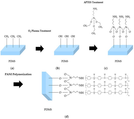 PDMS surface modification: (a) pristine PDMS; (b) O2 plasma treatment; (c) APTES treatment; (d) PANI polymerization after surface modification.