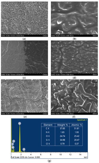 We selected PDMS as the substrate and confirmed PANI film growth based on surface treatment in the dilute polymerization process of PANI. The surface morphology and elemental composition were studied through SEM-coupled energy-dispersive X-ray spectroscopy (EDS) analysis. Figure 3a,b shows the growth of PANI on PDMS without any surface treatment (sample 1); it is seen that the PANI film was deposited on the PDMS surface such that the density was sufficiently secured. However, Figure 3c,d shows PANI growth after O2 plasma treatment of the PDMS (sample 2), and it is seen that the density is significantly less than that of PANI grown on pristine PDMS. This shows that synthesis is poor when PANI is grown immediately after O2 plasma treatment. The formation of –OH group on PDMS substrate alone proves that PANI is difficult to synthesize normally. Figure 3e,f shows that APTES treatment was performed immediately after O2 plasma treatment of the PDMS, followed by PANI growth (sample 3); here, the shape itself is not much different from the sample with PANI growth on pristine PDMS, but the density is sufficiently ensured, thickness is greater, and linkage is better. The EDS pattern of the sample 3 (Figure 3g) show several peaks for the PANI film, with carbon (C) and nitrogen (N) signals representing PANI, silicon (Si), and oxygen (O) signals derived from APTES surface treatment, and chloride (Cl) signals from perchloric acid.