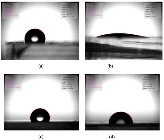 Comparison of contact angles: (a) pristine PDMS; (b) PDMS after O2 plasma treatment; (c) PANI growth on PDMS after O2 plasma treatment; and (d) PANI growth on PDMS after O2 plasma and APTES treatments.