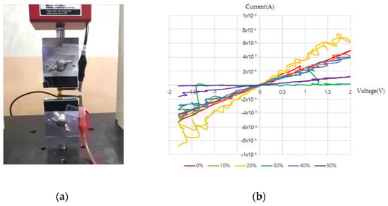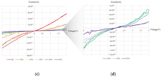 We conducted I–V measurements according to the strain for PANI on pristine PDMS and PANI on PDMS after O2 plasma and APTES treatments. PANI on PDMS after O2 plasma treatment is judged to have not been polymerized on the substrate because of significantly lower coverage than those of the other samples, thereby showing the characteristics of poor conductor; hence, I–V measurements were not shown here. Figure 6a shows the current measurements performed by attaching nickel tape and varying the voltage from −2 V to 2 V in steps of 0.1 V with dual sweeping. The strain was assessed for 0%, 10%, 20%, 30%, 40% and 50%, and Figure 6b–d shows the I–V values according to each strain. Figure 6b shows I–V trends according to strain of the PANI polymerization sample for pristine PDMS. When strain was 0%, it showed about 5 × 10−9 A at 2 V, and as seen from the graph, it was not possible to ensure stable current values based on the voltage and strain values. Figure 6c shows the I–V measurements for PANI on PDMS after O2 plasma and APTES treatments, which has a value of 6 × 10−7 A at 2 V with 0% strain, and it was possible to obtain stable measurements depending on the voltage. In addition, when the strain was gradually increased from 0% to 50%, the current decreased, and when the maximum tensile value was 50%, a current of about 3 × 10−8 A was obtained. It should be noted here that a stable current value was seen in accordance with the voltage value for voltages of 0 V to 2 V, and the current value tended to decrease in accordance with 0% to 50% strain.