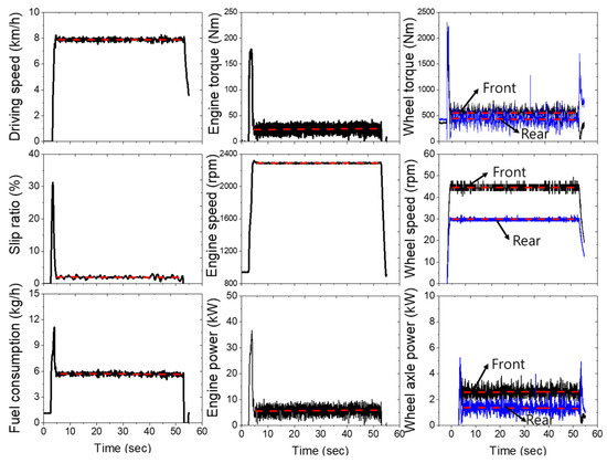 Figure 4 shows the measurement result of the driving load under no-load conditions. During straight path driving, the average driving speed under the no-load condition was 7.87 km/h with a slip ratio of 2%. In the case of the engine load, the average engine torque of the tractor was 22.8 Nm, the average engine speed was 2290 rpm, and approximately 5.5 kW of engine power was used (15.4% engine power ratio), with an average fuel consumption of 5.73 kg/h. In the case of the wheel axle load, the power requirement for the front axle was 2.6 kW (wheel axle torque of 553.1 Nm, wheel axle speed of 44.5 rpm), and the power requirement for the rear axle was 1.4 kW (wheel axle torque of 444.4 Nm, wheel axle speed of 29.8 rpm). The front wheel axle load tends to be higher than the rear wheel axle load because a weighed ballast or a front loader is attached to the front of the tractor to prevent problems such as overturning due to the effect of the pitch angle by load transfer.